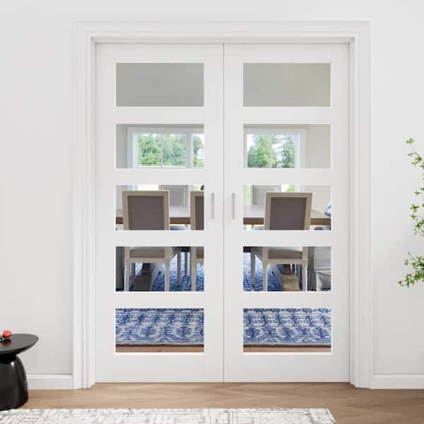 60 in. x 80 in. Universal 5-Lite Clear Glass White Solid Core Wood Double Prehung French Door with Quick Assemble Jamb