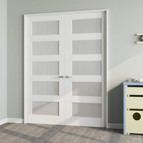60 in. x 80 in. Universal 5-Lite Frosted Glass White Solid Core MDF Double French Door with Quick Assemble Jamb