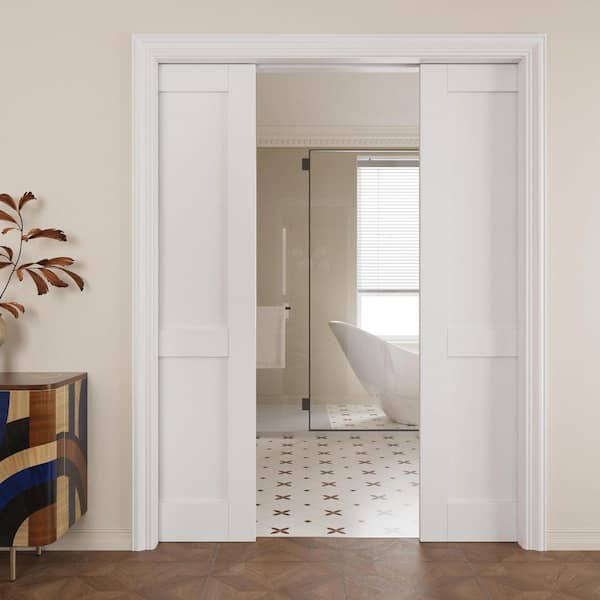 60 in. x 80 in. White Primed 2 Lite Wood Door with Solid Core Sliding Pocket Door Frame with Hardware and Soft Close