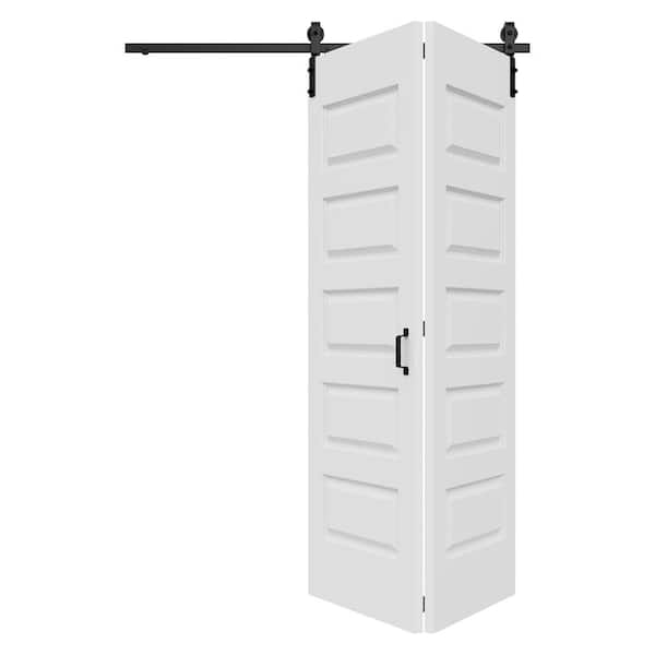 60 in. x 84 in. Paneled 5-Lite White Primed Hollow Core MDF Composite Bi-fold Door with Bifold Barn Door Hardware
