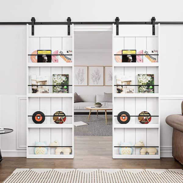 60 in. x 84 in. White Primed Composite MDF Shelves Sliding Barn Door with Hardware Kit and Soft Close