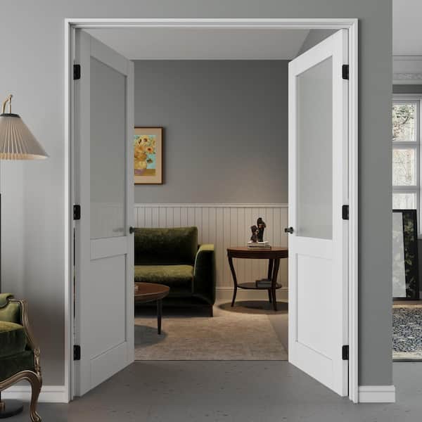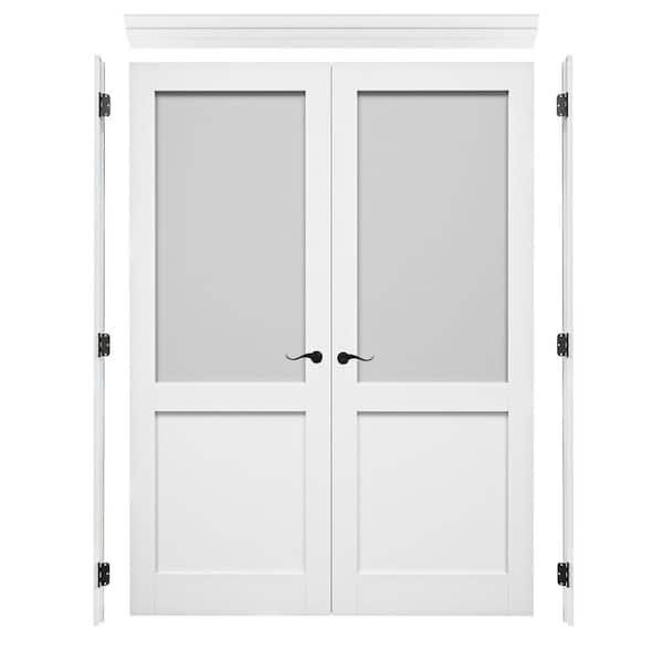 60 in. x 96 in. Universal Handed 1/2-Lite Frosted Glass White Solid Core French Door with Quick Assemble Jamb
