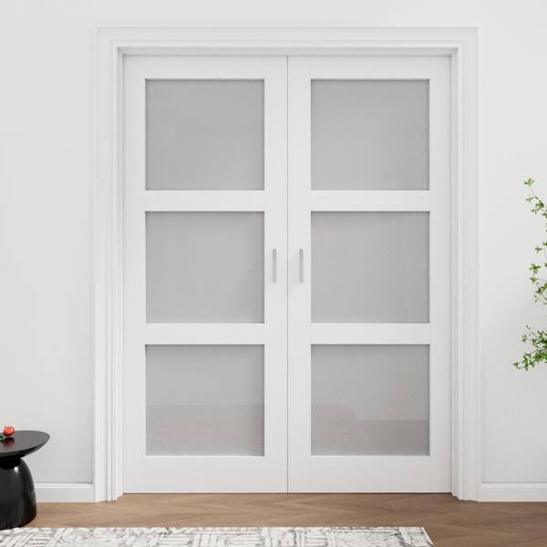 60 in. x 96 in. Universal Handed 3-Lite Frosted Glass White Solid Core MDF Double French Door with Quick Assemble Jamb