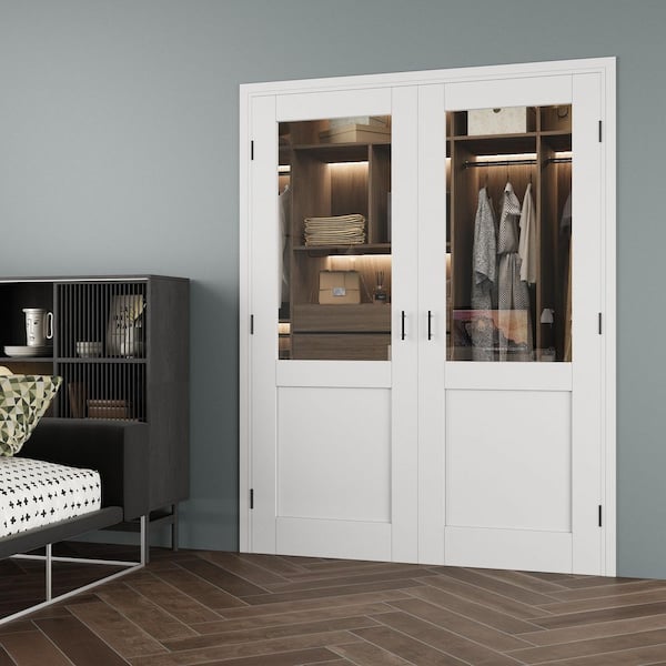 64 in. x 80 in. 1/2-Lite Clear Glass Universal White Solid Core Glass Double Prehung French Door + Quick Jamb&Ball Catch