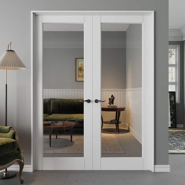 64 in. x 80 in. 1-Lite Clear Glass Universal White Solid Core Glass Double Prehung French Door Plus Quick Assemble Jamb