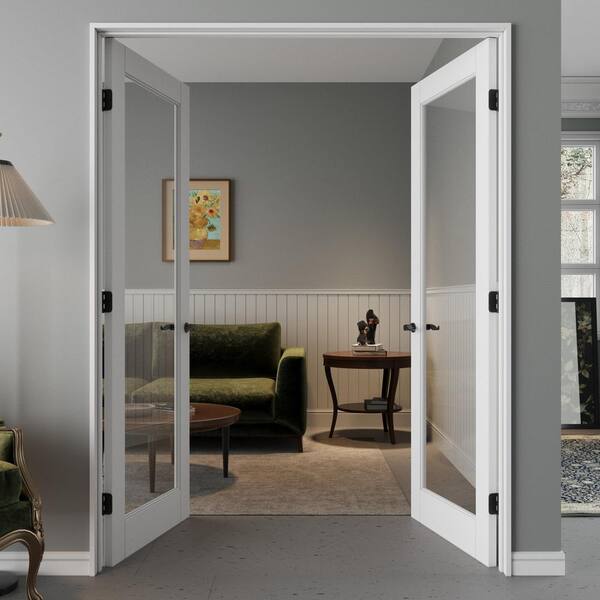 64 in. x 80 in. 1-Lite Clear Glass Universal White Solid Core Glass Double Prehung French Door+ Quick Assemble Jamb