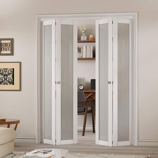 64 in. x 80 in. 1-Lite Tempered Frosted Glass Solid Core White Finished MDF Close Bi-Fold Door with Hardware