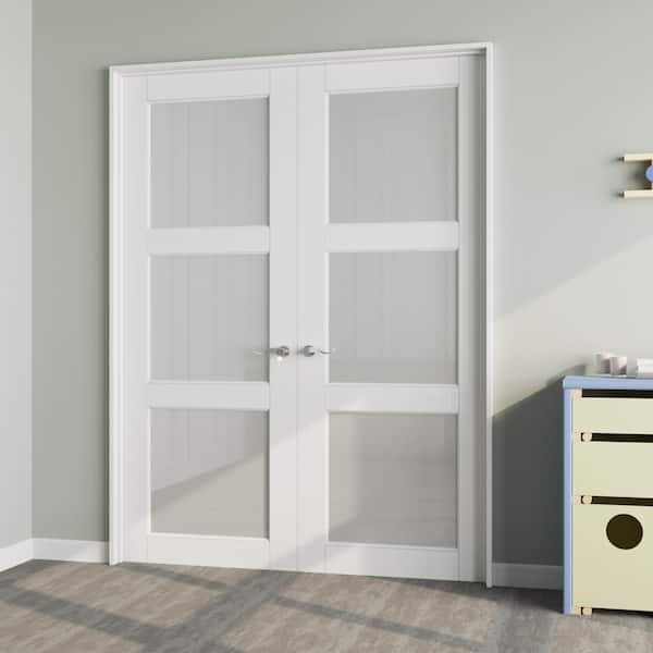 64 in. x 80 in. Universal Handed 3-Lite Frosted Glass White Solid Core MDF French Door with Quick Assemble Jamb