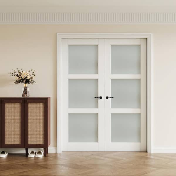 64 in. x 96 in. 3-Lite Frosted Glass White Solid Core Wood Finished MDF Prehung French Door with Quick Assemble Jamb Kit