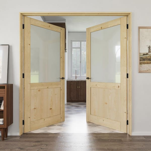 72 in. x 80 in. 1/2-Lite Frosted Glass Universal Solid Core Unfinished Pine Wood Double Prehung French Door+ Pine Jamb
