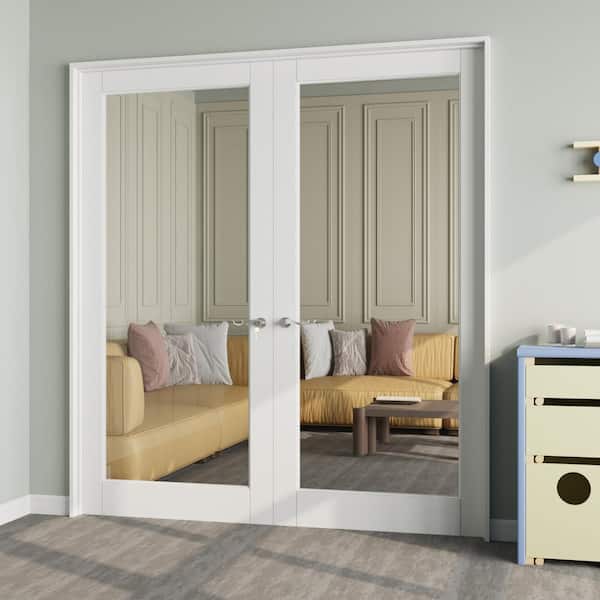 72 in. x 80 in. 1-Lite Clear Glass Universal White Solid Core Wood Double French Door with Quick Assemble Jamb