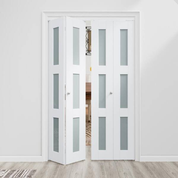 72 in. x 80 in. 3-Lite Tempered Frosted Glass Solid Core Dark Walnut MDF Bi-fold Door with Hardware Kit