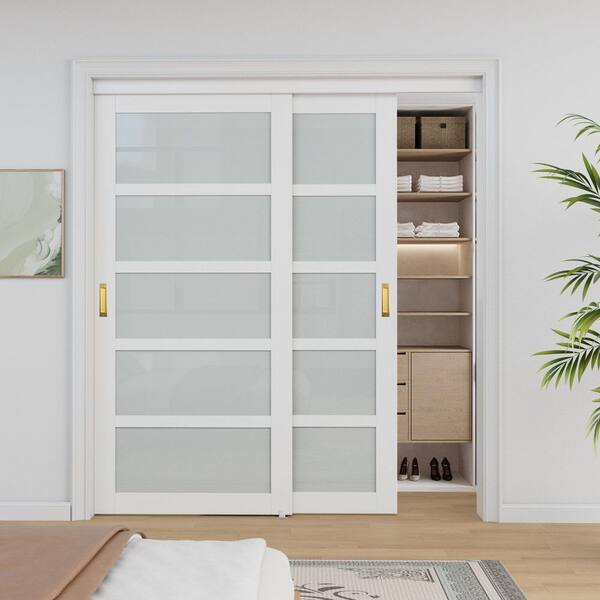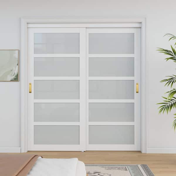 72 in. x 80 in. 5-Lite Frosted Glass Primed White MDF Closet Sliding Door No Grooving Black Handles and Hardware