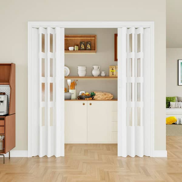 72 in. x 80 in. White Double PVC Material With 4-Lite Frosted Acrylic Panel Accordion Door With Installation Hardware