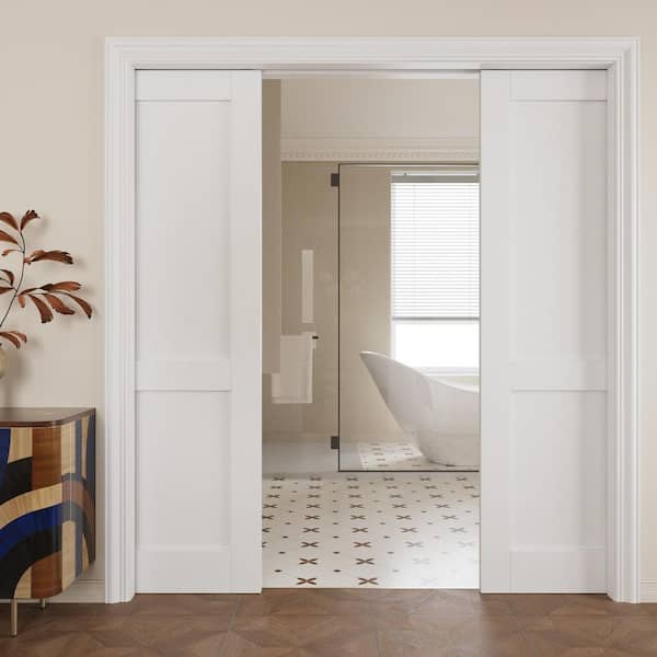72 in. x 80 in. White Primed 2 Lite Wood Door with Solid Core Sliding Pocket Door Frame with Hardware and Soft Close