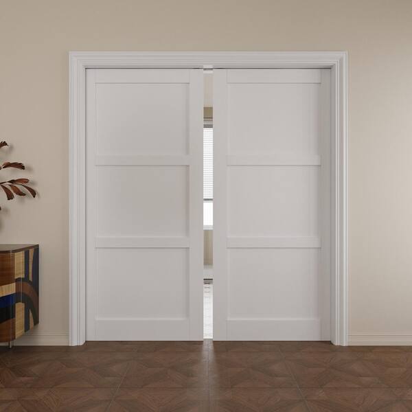 72 in. x 80 in. White Primed 3 Lite MDF Door with Solid Core Pocket Sliding Door Frame with Hardware and Soft Close