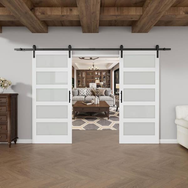 72 in. x 84 in. 5-Lite Tempered Frosted Glass White Primed MDF Wood Sliding Barn Door with Hardware Kit