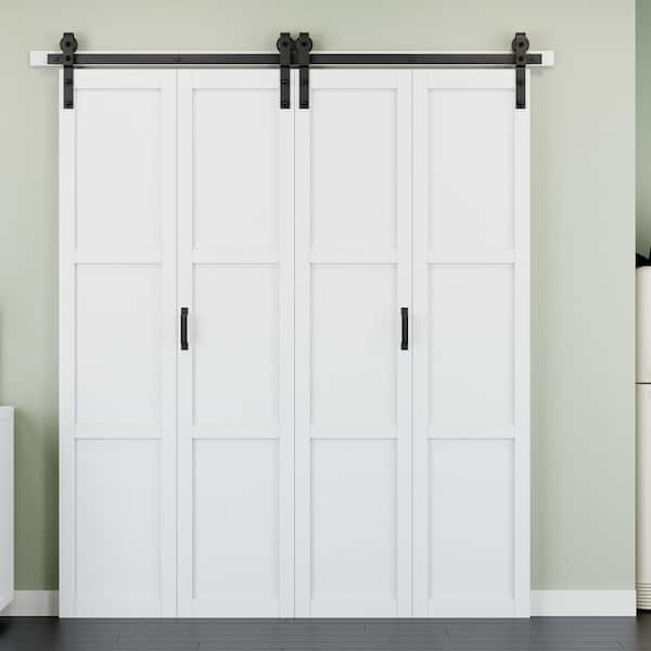 72 in. x 84 in. Paneled 3-Lite White Primed Solid Core MDF Bi-fold Sliding Barn Door with Hardware Kit