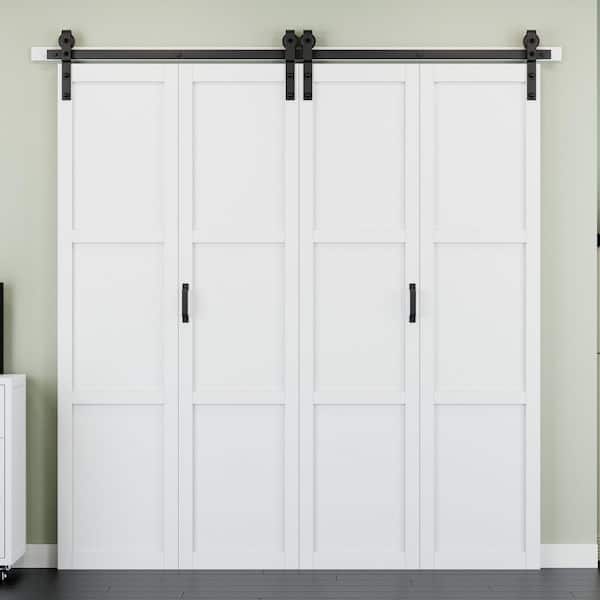 80 in. x 84 in. Paneled 3-Lite White Primed Solid Core MDF Bi-fold Sliding Barn Door with Hardware Kit
