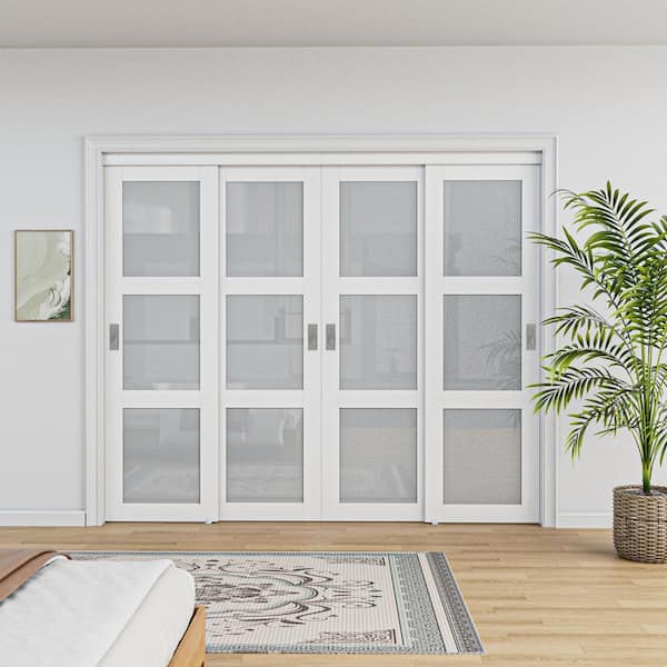 96 in. x 80 in. 3-Lite Frosted Glass White Finished MDF Interior Closet Sliding Door with Hardware and Sliver Handles