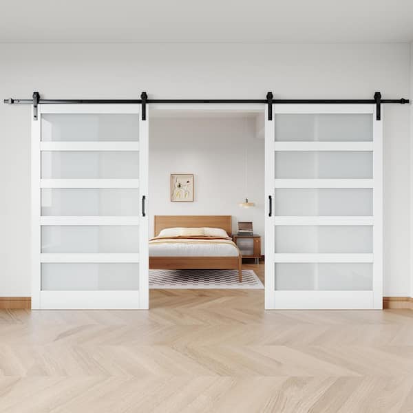 96 in. x 84 in. 5-Lite Tempered Frosted Glass White Primed MDF Wood Sliding Barn Door with Hardware Kit and Soft Close