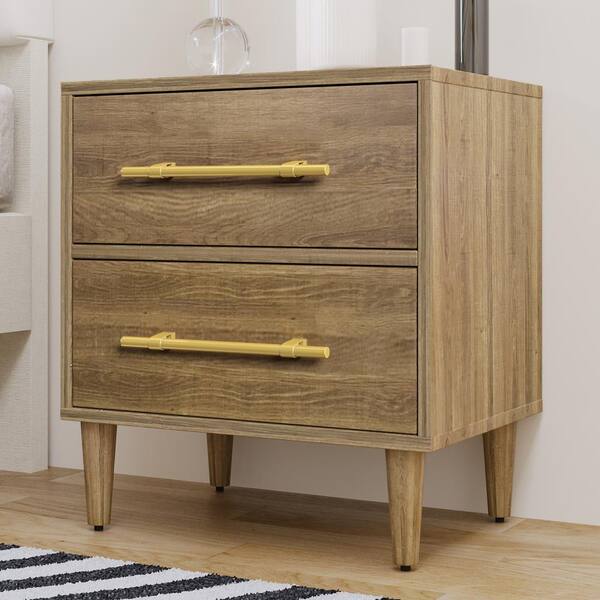 2-Drawer Natural Walnut Nightstand with Golden Handles 23 in. L x 17 in. W x 25.3 in. H