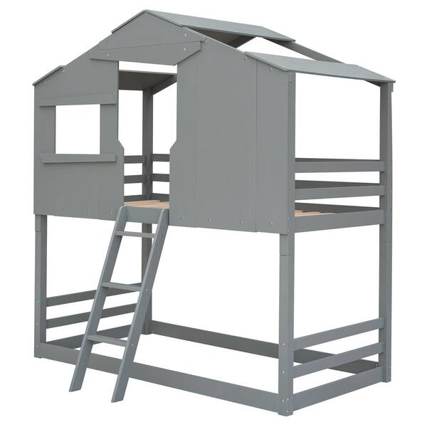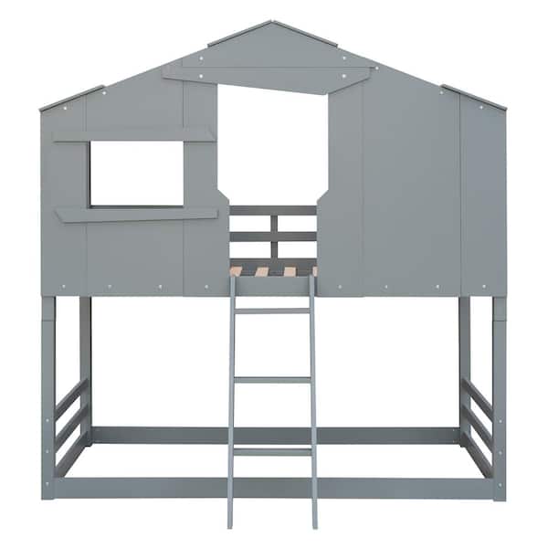 Gray Twin Over Twin House Bunk Bed With Ladder