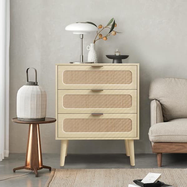Natural 3-Drawer Wood Rattan Storage Nightstand (23.6 in. D x 15.35 in. W x 29.5 in. H)