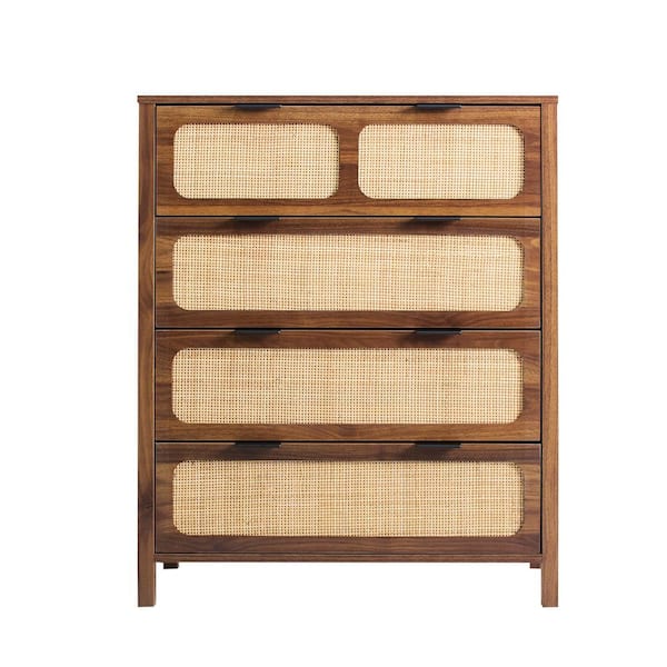 Walnut Wooden Rattan 4-Drawer Storage Cabinet Dresser (15.74in.D x 29.52in.W x 35.43in.H)