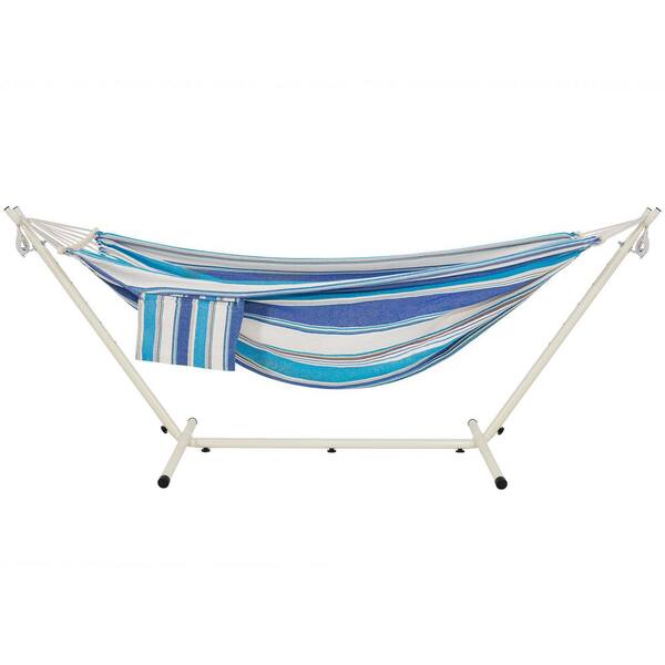 9 ft. 2 Person Heavy Duty Outdoor Hammock with Durable Steel Stand, Rope Bracket, Carring Bag, Blue Stripes