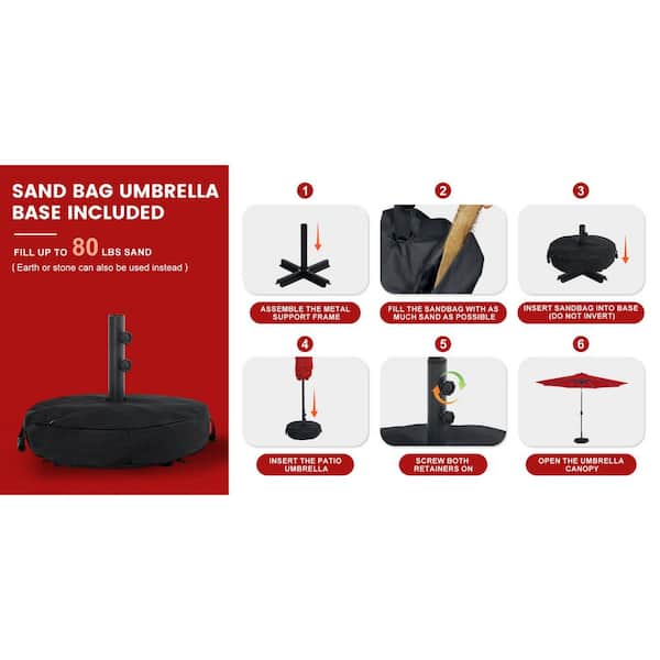 9 ft. Red Round Solar LED Metal Rotation Cantilever Offset Outdoor Patio Umbrella with a Base in Sand