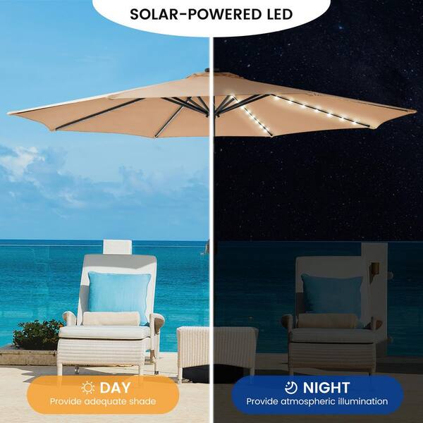 9 ft. Tan Round Solar LED Metal Rotation Cantilever Offset Outdoor Patio Umbrella with a Base in Sand