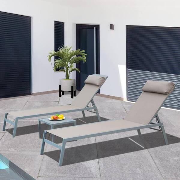 Pool Chaise Lounge Chairs Set of 3, Aluminum Outdoor Reclining Adjustable Chairs for Sunbathing, Beach, Patio, Khaki