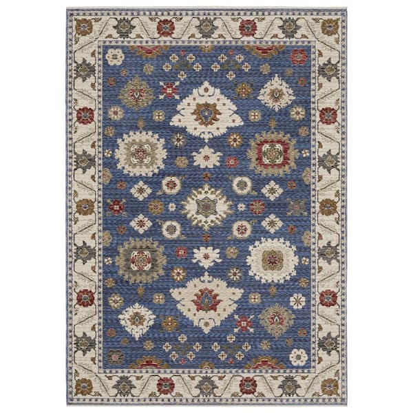 Hunter Blue/Ivory 4 ft. x 6 ft. Traditional Floral Oriental Polyester Fringe-Edge Indoor Area Rug