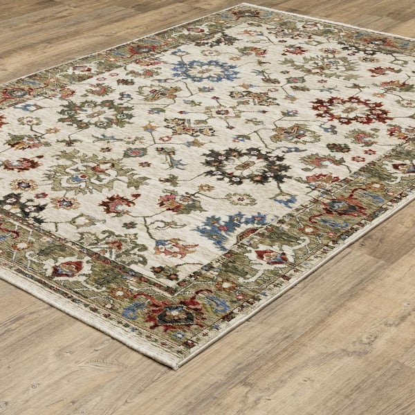 Hunter Ivory/Green 2 ft. x 8 ft. Bordered Oriental Polyester Fringe-Edge Indoor Runner Area Rug