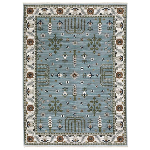 Key Blue/Green 10 ft. x 13 ft. Traditional Oriental Floral Polyester Fringed-Edge Indoor Area Rug