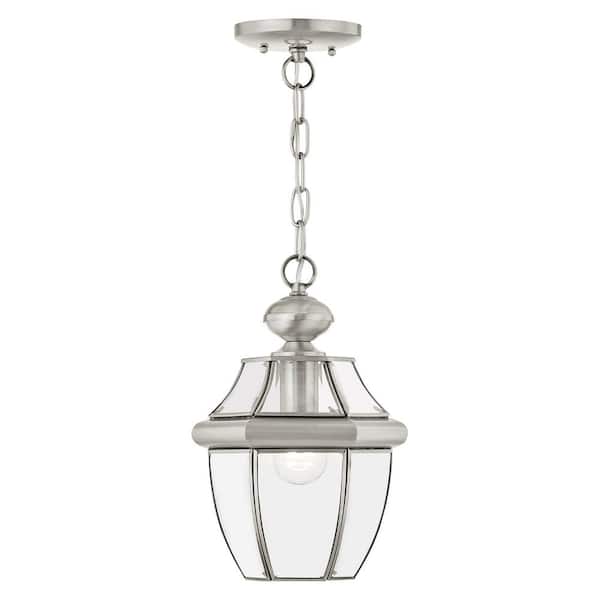 Aston 12.75 in. 1-Light Brushed Nickel Dimmable Outdoor Pendant Light with Clear Beveled Glass and No Bulbs Included