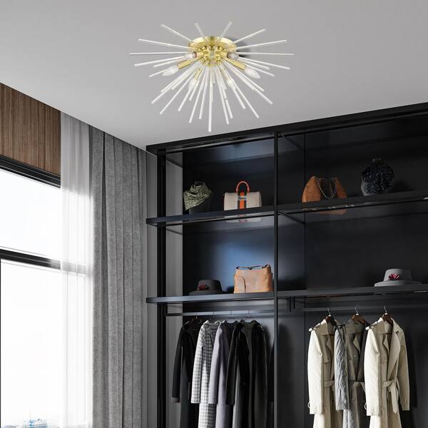 Delano 25.75 in. 6-Light Satin Brass Starburst Semi Flush Mount with Clear Glass Rods