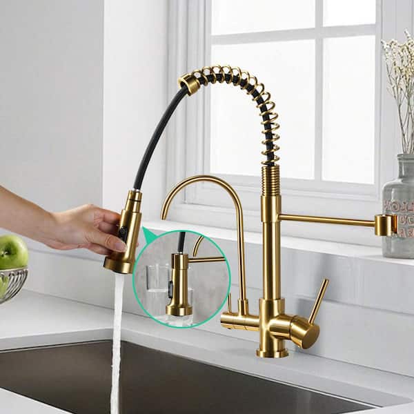 17.5 in. Double Handle Pull Down Spray Kitchen Faucet with Drinking Water Filter and 360° Spout in Brushed Gold