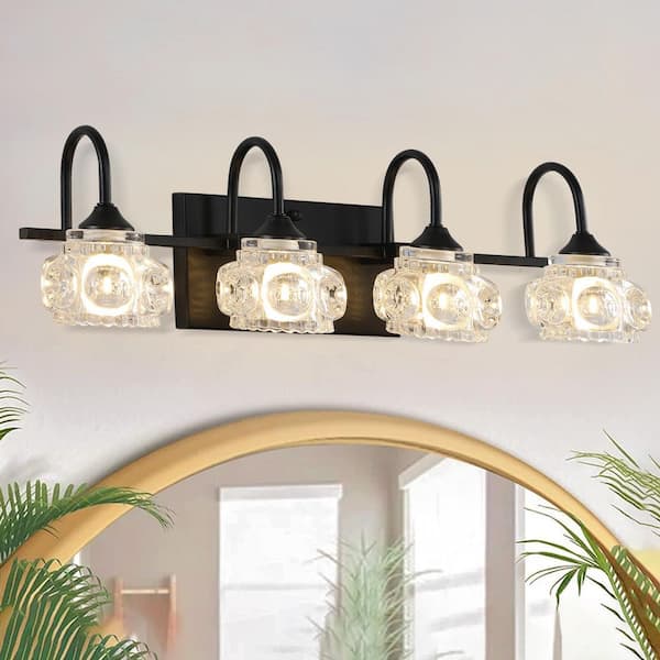 22.8 in. 4-Light Modern Black Crystal Bathroom Vanity Light with Clear Glass Shade for Bathroom(Blulbs Not Included)