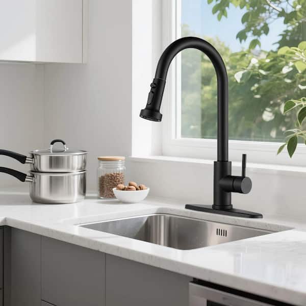 3-Mode Single Handle Pull Down Sprayer Kitchen Faucet with Deckplate in Black