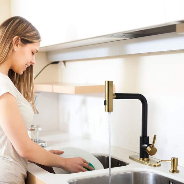 3-Mode Single Handle Waterfall Pull Down Sprayer Kitchen Faucet with soap dispenser in Stainless Steel Black and Gold