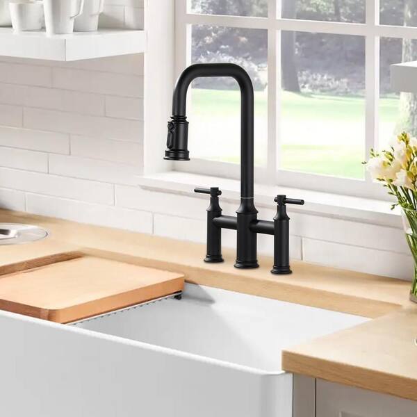 3 Patterns Double Handle Pull Down Bridge Kitchen Faucet with 360° Swivel Spout for 3 Holes in Matte Black