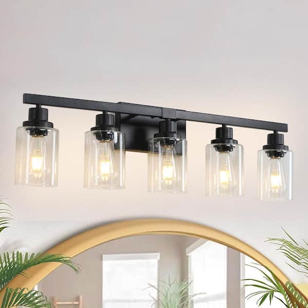 31.1 in. 5-Light Rustic Black Bathroom Vanity Light with Clear Glass Shades for Mirror, Vanity (Bulb Not Included)