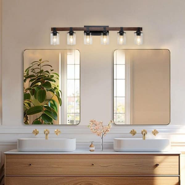 42.3 in. 6-Light Rustic Walnut Bronze Bathroom Vanity Light with Clear Glass Shades Mirror, Vanity (Bulb Not Included)