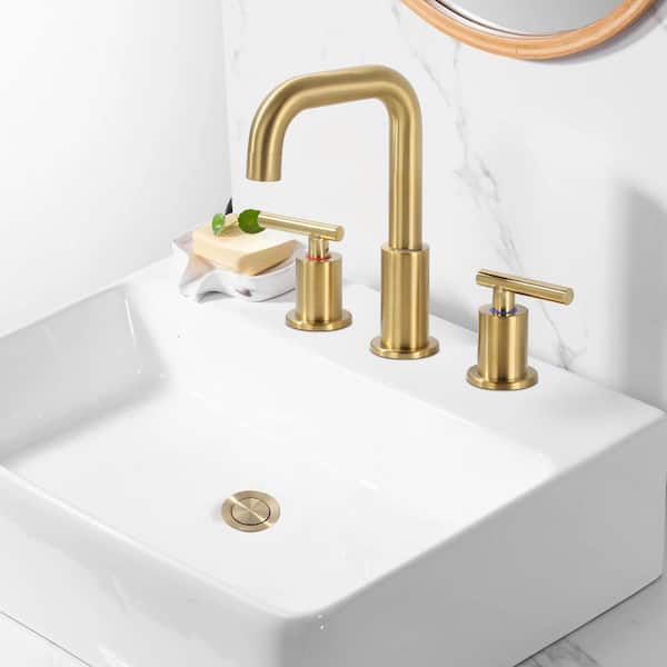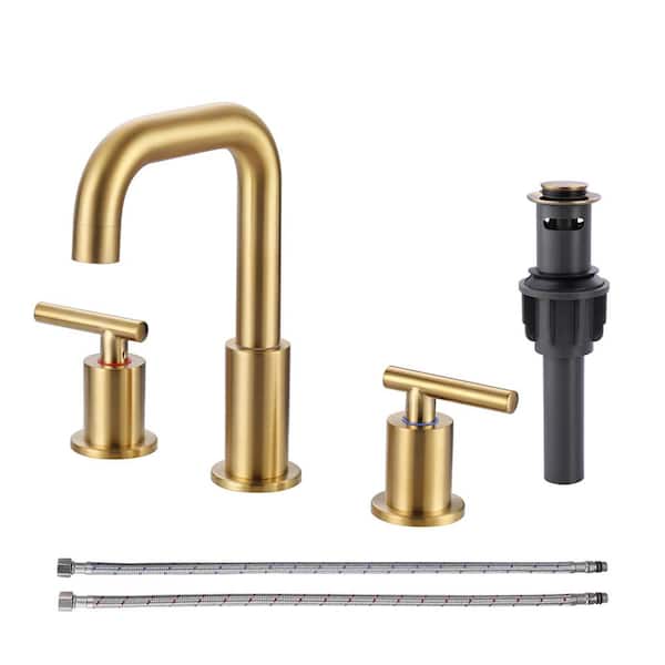 8 in. Widespread Double Handle Bathroom Faucet with Drain Kit and Supply Lines Included in Brushed Gold