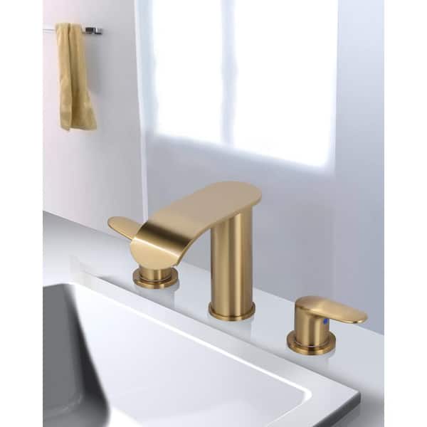8 in. Widespread Modern Double Handle Waterfall Bathroom Faucet with Pop-up Drain and Supply Hoses in Brushed Gold