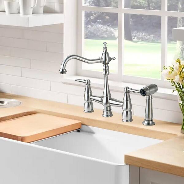 Brass Double Handle Bridge Kitchen Faucet with Side Sprayer in Brushed Nickel