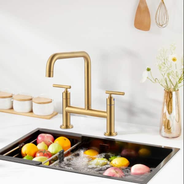Double Handle 2-Hole Solid Brass Bridge Kitchen Faucet with 360° Rotation Spout in Brushed Gold