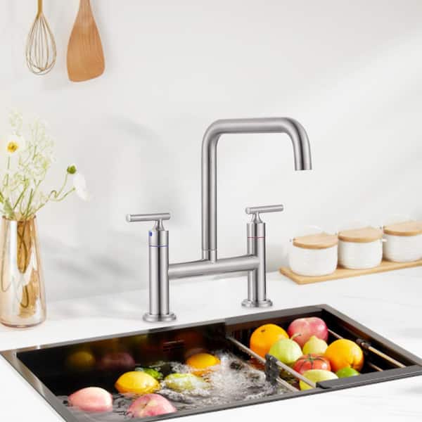 Double Handle 2-Hole Solid Brass Bridge Kitchen Faucet with 360° Rotation Spout in Brushed Nickel